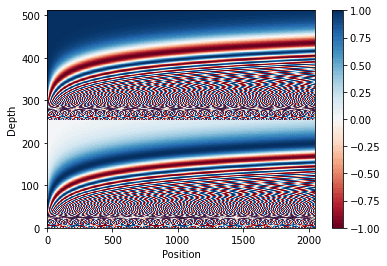 import matplotlib.pyplot as plt pos_encoding = positional_encoding(length=2048, depth=512) assert pos_encoding.shape == (2048, 512) # Plot the dimensions. plt.pcolormesh(pos_encoding.numpy().T, cmap='RdBu') plt.ylabel('Depth') plt.xlabel('Position') plt.colorbar() plt.show()